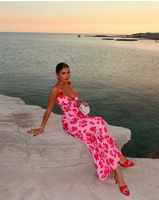 Robe rouge patineuse mi-longue – Dos nu & nœuds perles